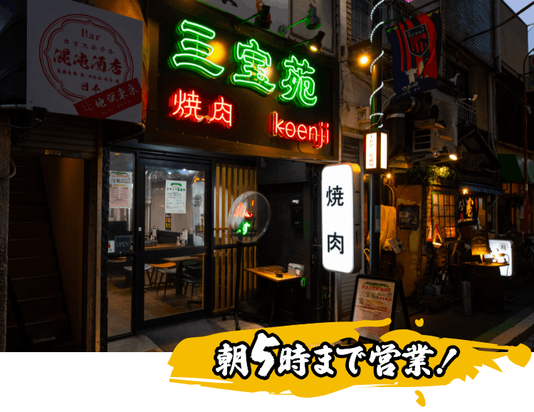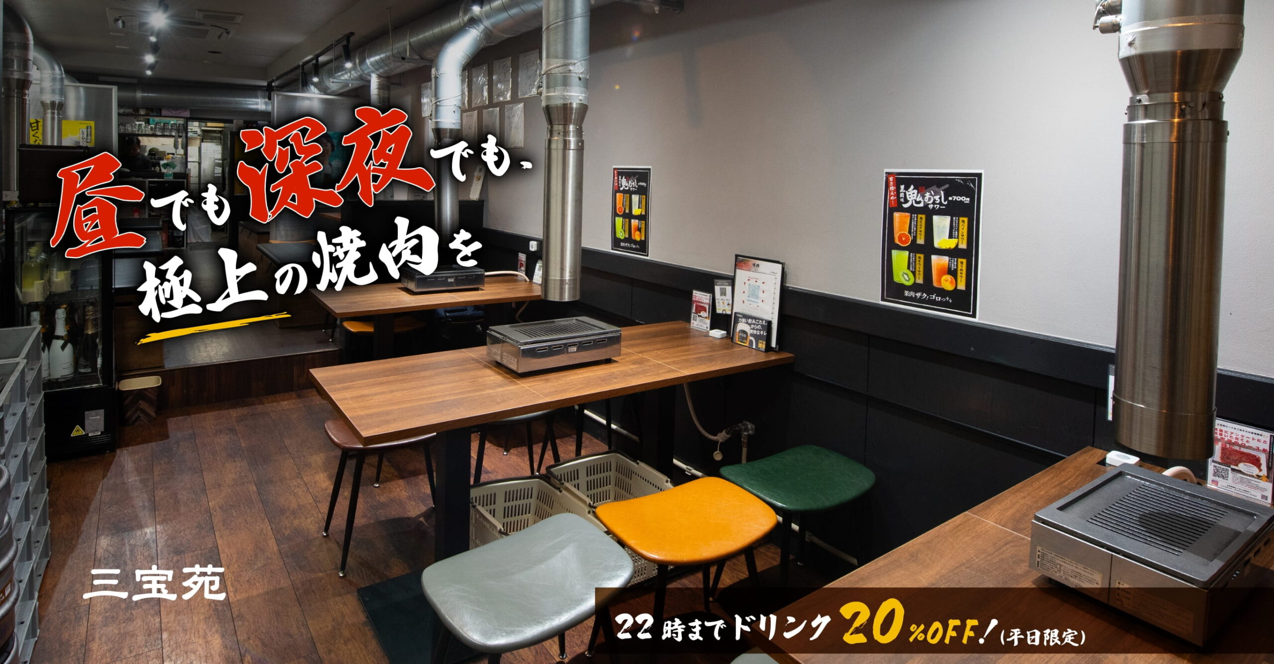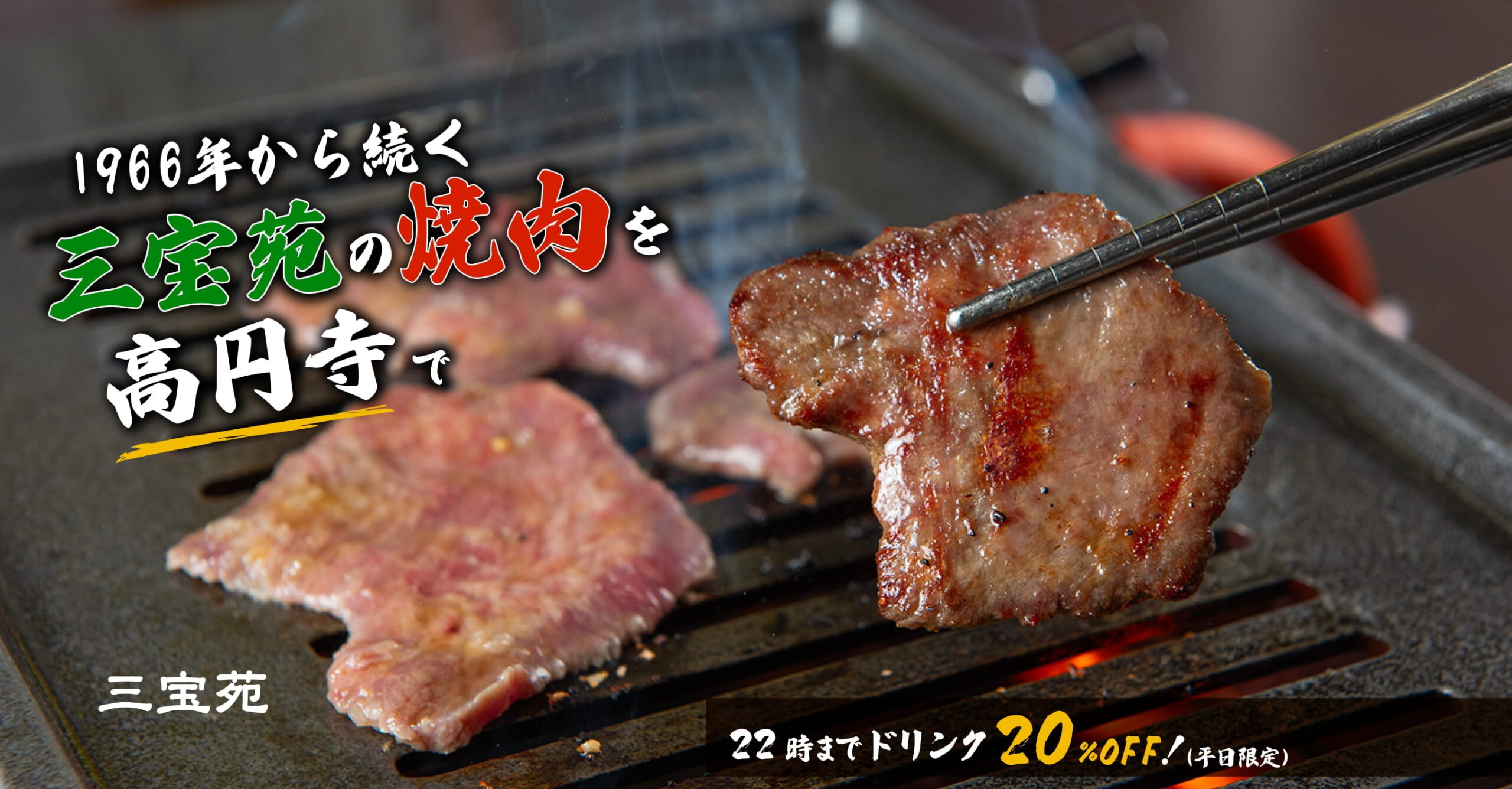 高円寺にある「三宝苑 koenji」は、野方で1966年に創業した「焼肉レストラン 三宝苑」の味を受け継ぐ焼肉店。厳選した黒毛和牛の焼肉を中心に、こだわりの一品料理を気軽にお楽しみいただけます。朝5時まで営業しているため、お仕事帰りや遅い時間のお食事にもおすすめ。平日限定で22時まではドリンク20%OFFのサービスもご用意しており、普段使いから大人数での宴会まで、幅広いシーンでご利用いただけます。
