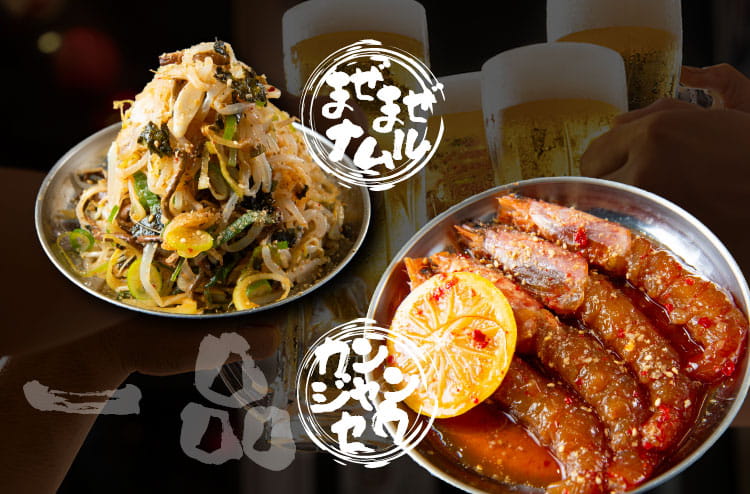 焼肉と一緒に楽しめる一品料理も豊富にご用意しています。なかでもおすすめの「まぜまぜナムル」は、塩ベースのさっぱりとした味わいにピリッとした辛味が効いた一皿。人気の「カンジャンセウ」は、鮮度抜群の海老を特製ダレに漬け込んだ、濃厚な旨みとぷりぷりとした食感が魅力です。焼肉とあわせて、こだわりの一品料理もぜひお楽しみください。