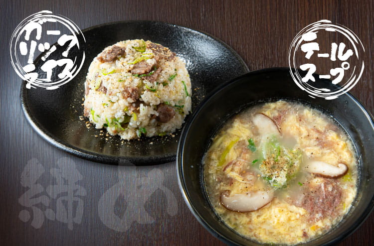 お食事の締めに楽しめるメニューも充実しています。なかでもおすすめなのが、8時間かけてテールをじっくり煮込んだ『テールスープ』。濃厚で旨みたっぷりの味わいが、食事の最後をしっかりと締めくくります。にんにく特有の香ばしさが食欲をそそる『肉メシ』も人気の一品です。